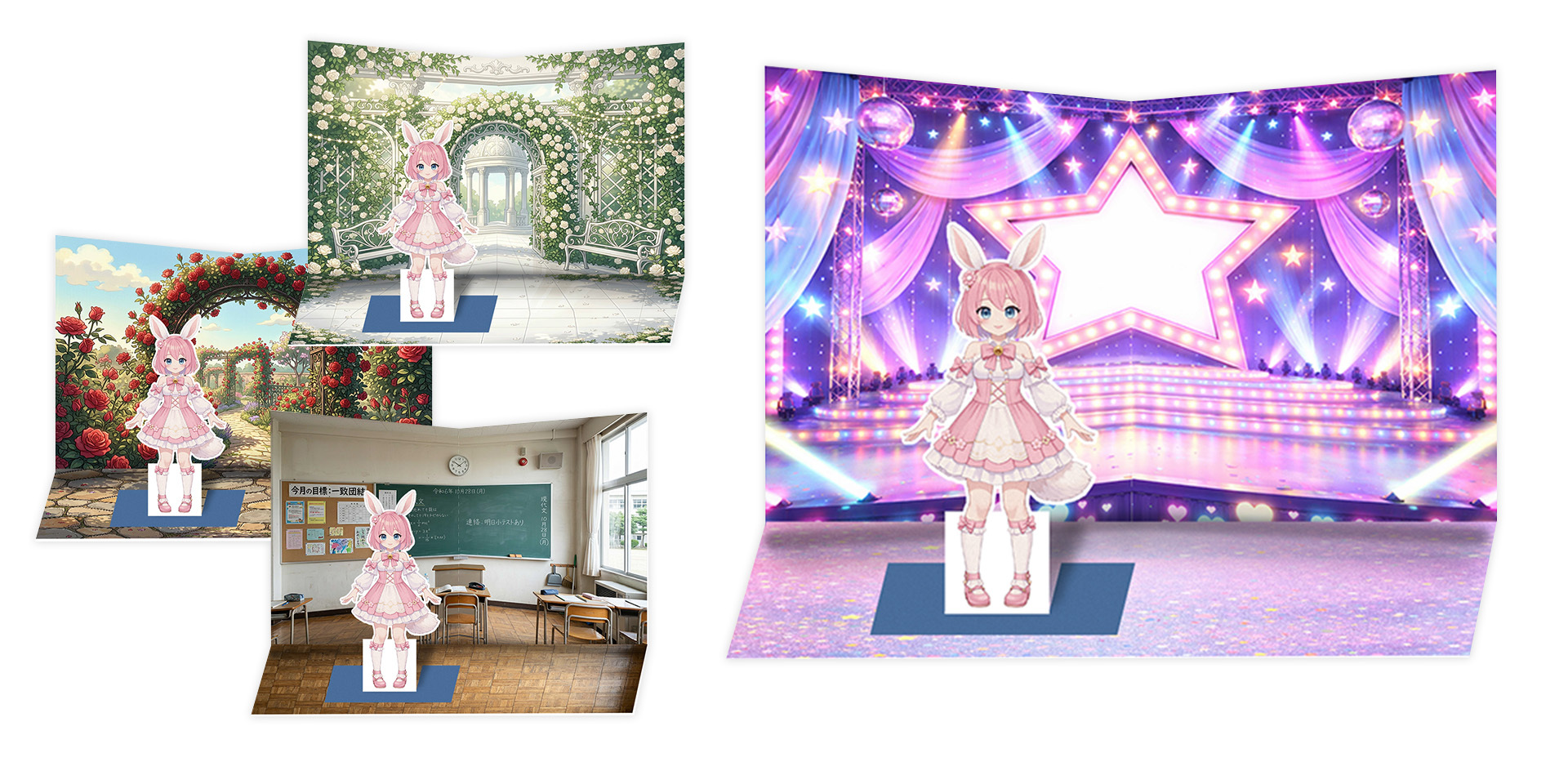 背景シートを選んでコンビニでA4光沢紙2枚プリント。スタンドの後ろに置いて使えます。
